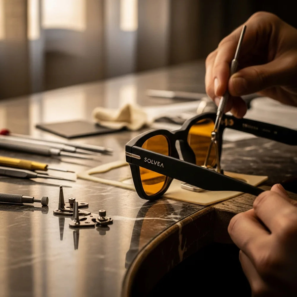 Every pair of Solvea Eyewear begins with precision and patience. From the first cut of acetate to the final engraved logo, each frame is shaped by skilled hands under warm, natural light — the same light that inspires our designs. It’s not mass production — it’s quiet craftsmanship, made to last a lifetime.
